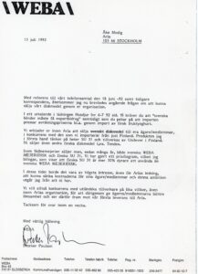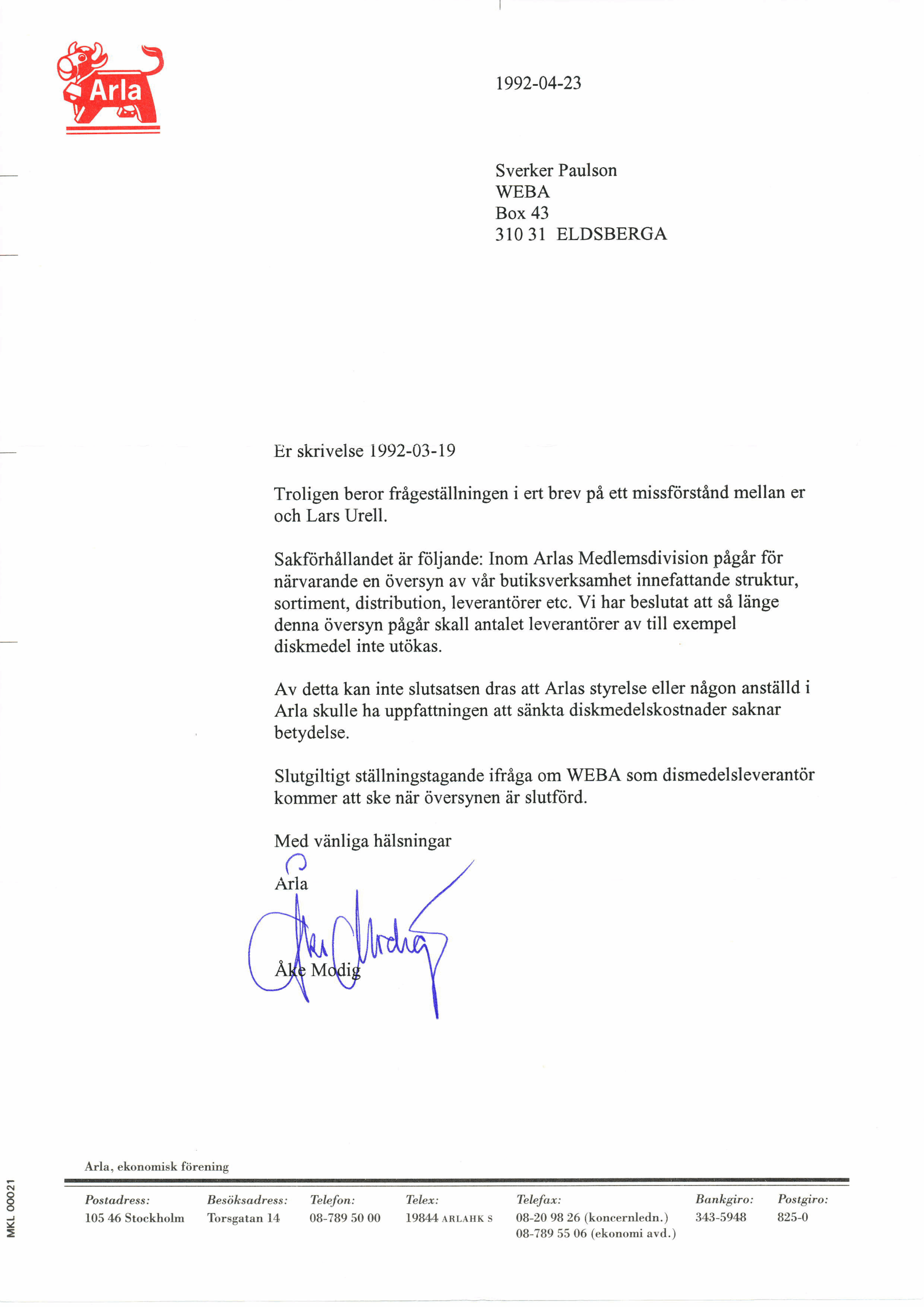 Vid ett avstämningsmöte, februari -93, på Arlas huvudkontor i Stockholm med Lennart Lindgren och Gösta Milan fick vi beskedet att: ”nu har ni fått chansen och tyvärr – det fungerade inte….”. Det var nästan pinsamt vilket iscensatt taskspel man bedrev. Våra argument om att en ny produkt säljer 7 ton diskmedel på några veckor i endast tre butiker inom Arla fick Lennart Lindgren att svänga. Det gjorde Gösta Milan osäker….(för de hade ju kommit överens om att avsluta samarbetet med WEBA). Gösta började gruffa med Lennart, men det var Lennart som bestämde. Det bestämdes att WEBAs diskmedel skulle ingå i Arla-butikernas ordinarie sortiment.