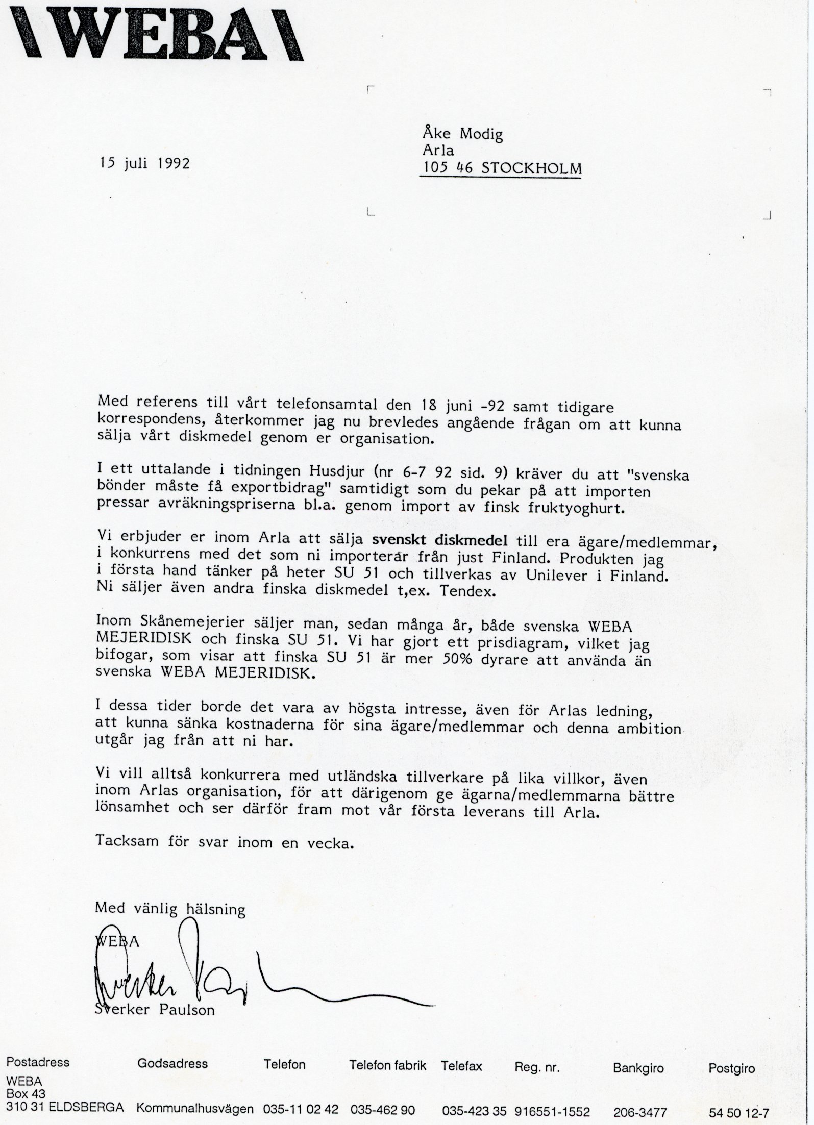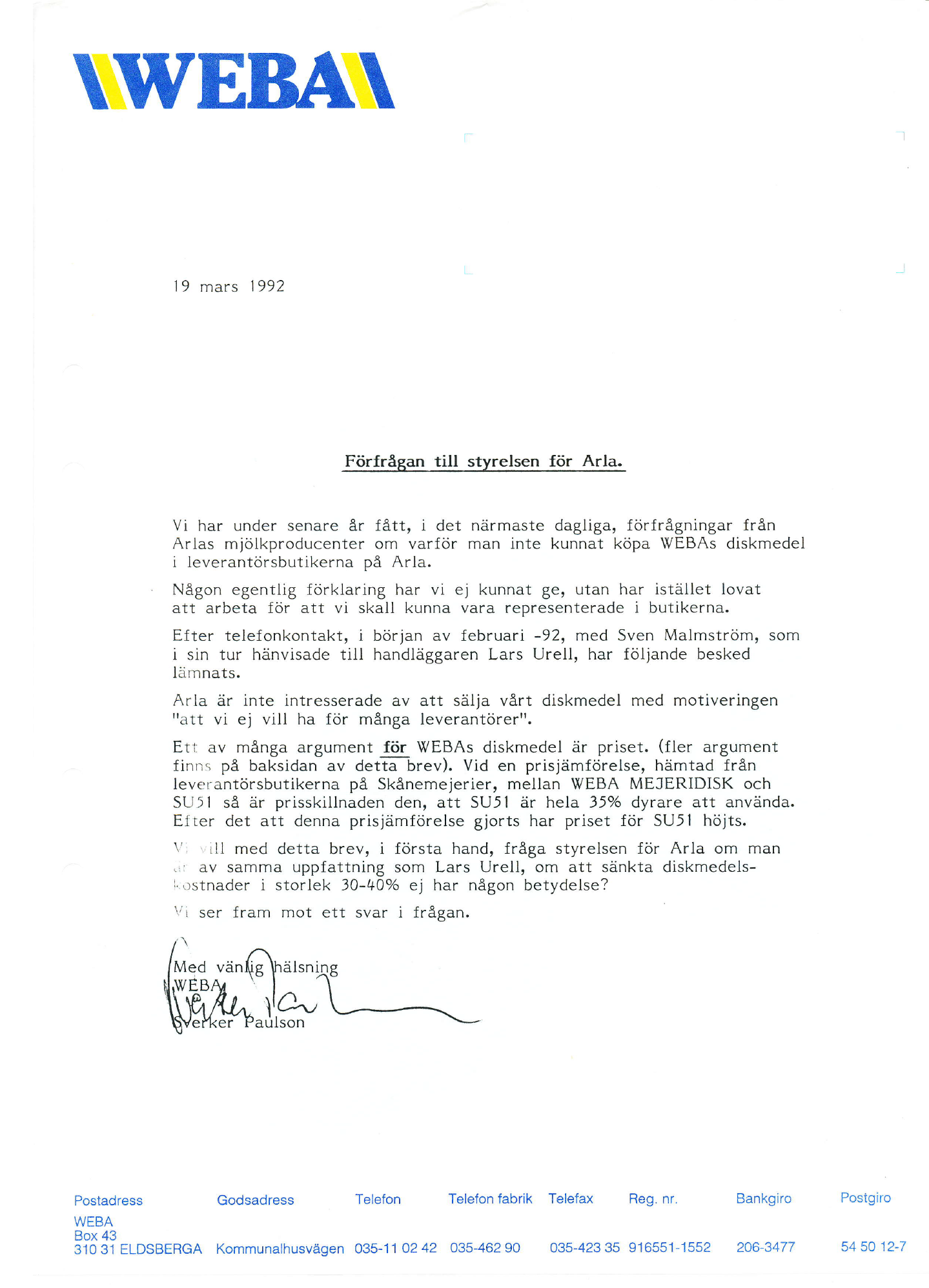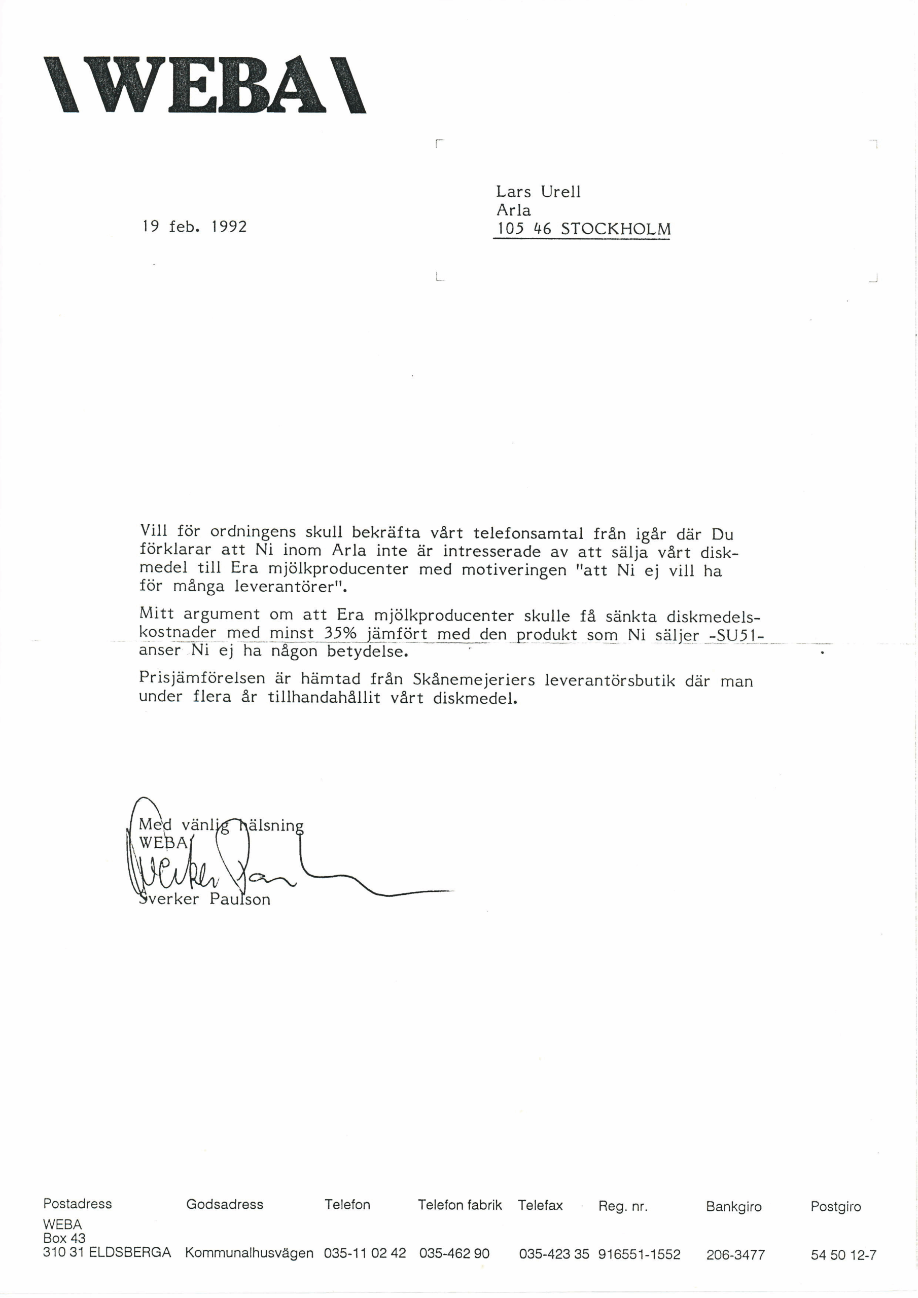I ett telefonsamtal med Arlas Lars Urell, feb 1992, förklarade Urell att man inte ville ha för många leverantörer. Argumentet att Arlas mjölkproducenter skulle få 35% lägre användningskostnad med svenska WEBA, jämfört mot finska SU51, saknade betydelse. Ingen reaktion på detta från Arla.