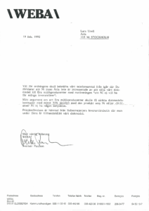 Vi hade många kontakter med Lennart Lindgren – dels personliga möten i Stockholm, Örebro, Linköping med flera ställen samt via telefon och ett stort antal offerter till Arla. Vi visade, i offerterna, på hur mycket pengar som Arlas mjölkproducenter skulle spara (minst 25%) genom att använda WEBA mejeridisk i stället för SU51. Ingen – absolut ingen av våra offerter kunde öppna dörren till Arlas leverantörsbutiker.