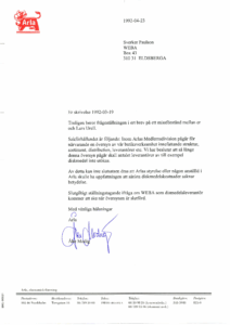 Han svarade då att detta var konfidentiellt och inte skulle lämnas ut. Vi förklarade för honom att eftersom vi lämnar garanti på diskmedlet behöver vi komma i kontakt med de berörda. Bertil Mattsson lovade då att han skulle skicka över namnen. Det lovade han dessutom att göra varje gång vi ringde! Eftersom inga namn kom skrev vi ett brev till honom och förklarade att om inte han skickade namnen skulle vi gå ut och annonsera efter dessa. Då kom namnen – 6 stycken!