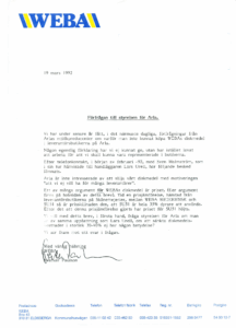 Vid ett avstämningsmöte, februari -93, på Arlas huvudkontor i Stockholm med Lennart Lindgren och Gösta Milan fick vi beskedet att: ”nu har ni fått chansen och tyvärr – det fungerade inte….”. Det var nästan pinsamt vilket iscensatt taskspel man bedrev. Våra argument om en försäljning av 7 ton diskmedel på några veckar för en ny produkt inom Arla fick Lennart Lindgren att svänga. Det gjorde Gösta Milan osäker….(för de hade ju kommit överens om att avsluta samarbetet med WEBA). Gösta började gruffa med Lennart, men det var Lennart som bestämde. Det bestämdes att WEBAs diskmedel skulle ingå i Arla-butikernas sortiment.