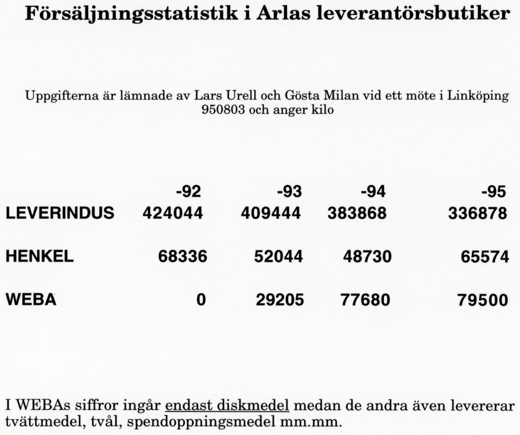 1993 sålde vi 29 ton diskmedel till Arlas mjölkproducenter samtidigt som Leverindus (Unilever) sålde 409 ton.